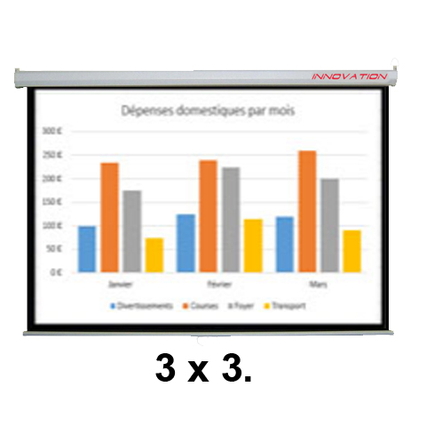 Les écrans de projection motorisés d'INNOVATION, s'adressent essentiellement à des applications professionnelles dans de grandes salles de séminaire/réunion. Vous pouvez l'opérer à l'aide d'une télécommande, ou bien encore à l'aide du boîtier de pilotage mural. Il est muni d'un moteur particulièrement silencieux. Il est destiné à un montage au mur, tout comme un montage au plafond, vue devant, Système fin de course haute sécurité & encadrement en noir pour plus de visibilité.