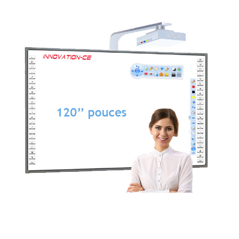 TABLEAU BLANC INTERACTIF smart technoligy 1- Multi-touches (10 Touches) : Soutenir le doigt ou un objet opaque pour écrire. 2- Logiciel d'enseignement puissant (fourni des dizaines d'outils pédagogiques) : Le logiciel utilisé conjointement avec le tableau blanc, Est un outil puissant et interactif idéal pour les utilisations éducatives et commerciales, facilite la collaboration et l'interaction dans les salles de classe ; l'enseignant et élève ecrice ,effacer , déplacer des objets, ajouter des pages et enregistrer. 3- Reconnaissance des gestes des doigts (utilisateur peut exécuter des nombreuses fonctions se connecte sur internet et contrôle des applications du doigt ou avec un stylet. 4- ( EN OPTION ) Logiciel de partage : Tableau intercatif vers ==> (Mobile, tablette , pc) (Mobile, tablette , pc) vers ==>Tableau interactif pour implémenter l'interaction entre les terminaux mobiles et les PC (écran de grande taille). -avec un terminal mobile, vous pouvez effectuer des opérations telles que cliquer, faire glisser, faire défiler et ajouter des commentaires sur un PC. -mise en miroir du bureau vers le mobile ou mise en miroir du mobile vers le bureau . -vous pouvez rapidement transmettre un fichier sur un terminal mobile à un PC via le réseau sans fil et lire le fichier. DIMENSIONS : Taille totale de la zone: 2727 x 1566 mm. Taille de projection: 2662 x 1498 mm. Taille totale de la diagonale de la zone: 123.8" Taille diagonale intérieure: 121". Taille diagonale de projection: 120.3 ". Rapport hauteur / largeur: 16: 9 ACCESOIRES : ** Barres de son (60w) ** ** Support mural ** ** Cable USB ** ** Stylos ** ** Pointeur ** ** La brosse ** ** Plumier ** ** Logiciel **